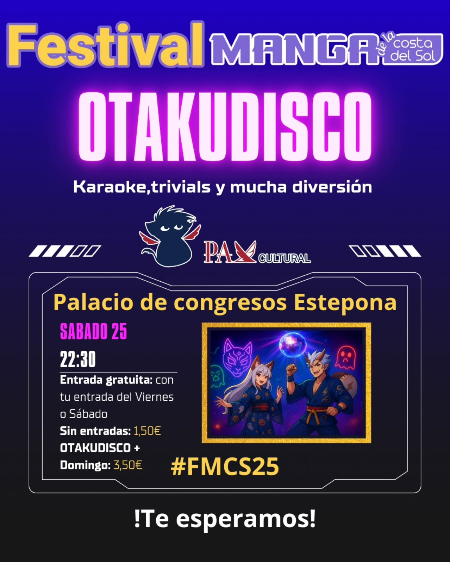 (puedes adquirirla directamente durante la fiesta)⚠️ ¡No te pierdas esta edición especial de Halloween japonés… donde el miedo y la fantasía se encuentran! 👻🎭#Otakudisco #FestivalMangaCostaSol #PaxCultural #Estepona #AnimeParty #KpopParty #HalloweenJapan #OtakusUnidos #FestivalManga #Otakufiesta🇬🇧 English version🎧✨ The geekiest night of the year is coming to the Costa del Sol Manga Festival! ✨🎧Get ready for the Otakudisco, our official party on Saturday, October 25th, featuring anime hits, K-Pop bangers, and viral tracks — all mixed with lights, cosplay, and nonstop fun! 🎵🔥🕺💃 Come with your best outfit, dance with your friends, and enjoy the ultimate anime party!